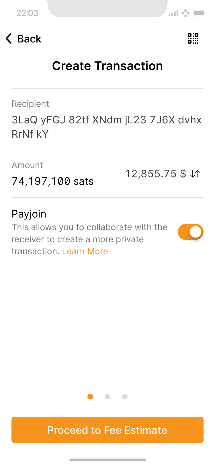 A wallet supporting payjoin presents a screen with payjoin already enabled.