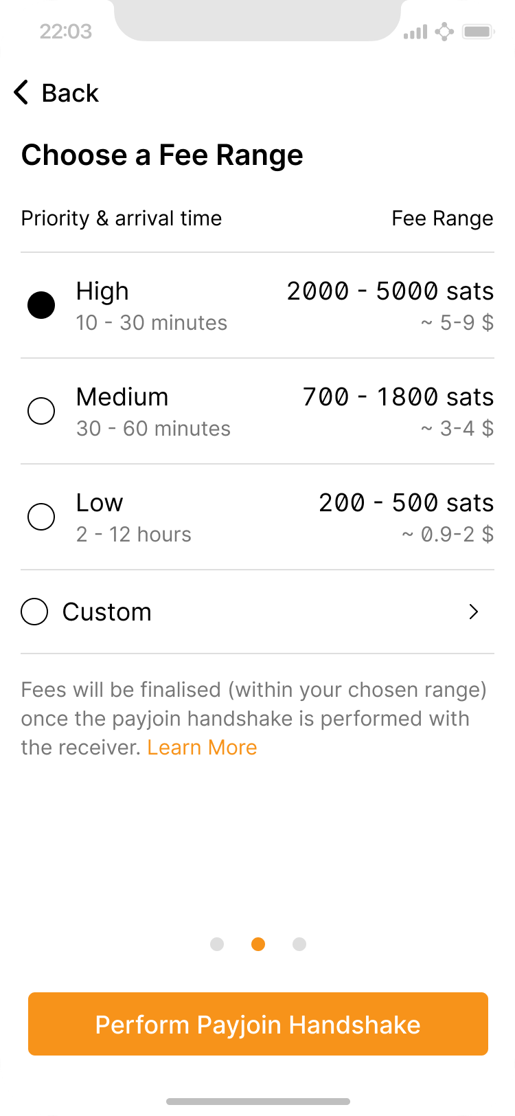 In short, the sender flow outlined here asks the user to choose a fee range instead of a fee amount (or fee rate), while keeping the rest of the user flow almost exactly the same. We use it to set 3 optional parameters specified in BIP-78, which can be used to construct a simple but effective payjoin implementation.