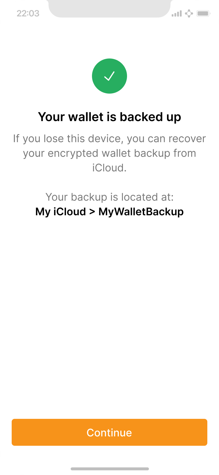 Before creating a wallet backup via cloud backup, make sure the user knows what they are about to do. Once the backup is complete, provide a summary and some reassurances before moving on. Let them know where in their cloud storage they can find their backup, and give the file an understandable name. For example, a filename like BitcoinWalletBackup_Samantha conveys far more meaning than a randomly generated number.