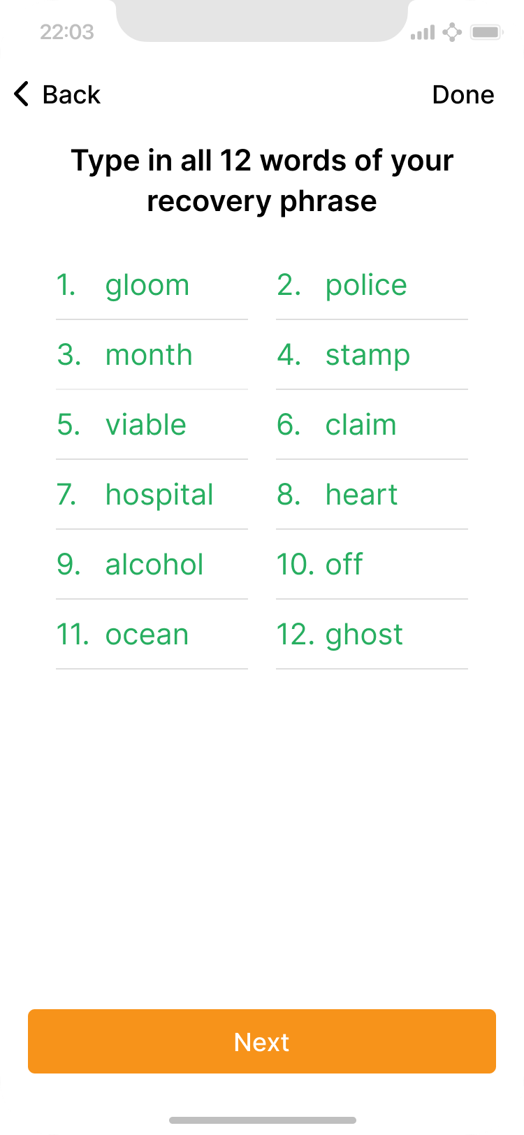 The user has finished entering their recovery phrase and taps "Next".