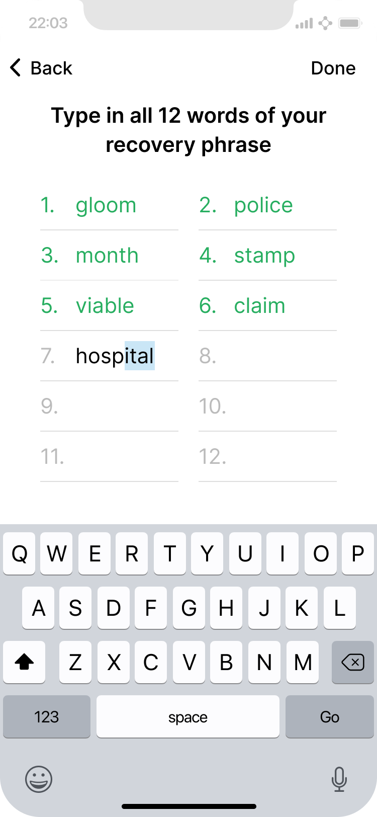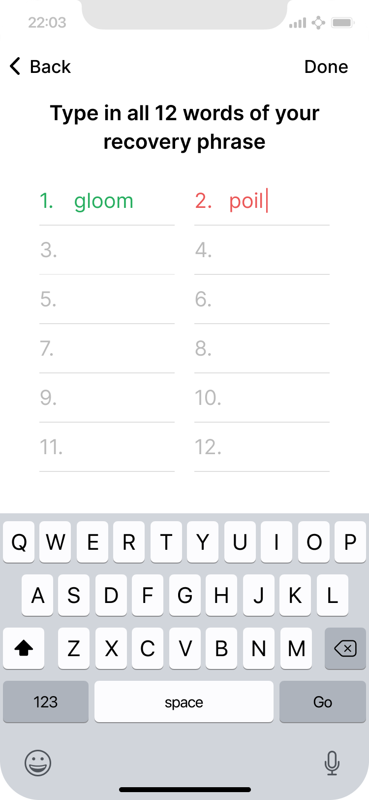 User enters their recovery phrase. The app can notify them if a word is incorrect before they have finished typing it.