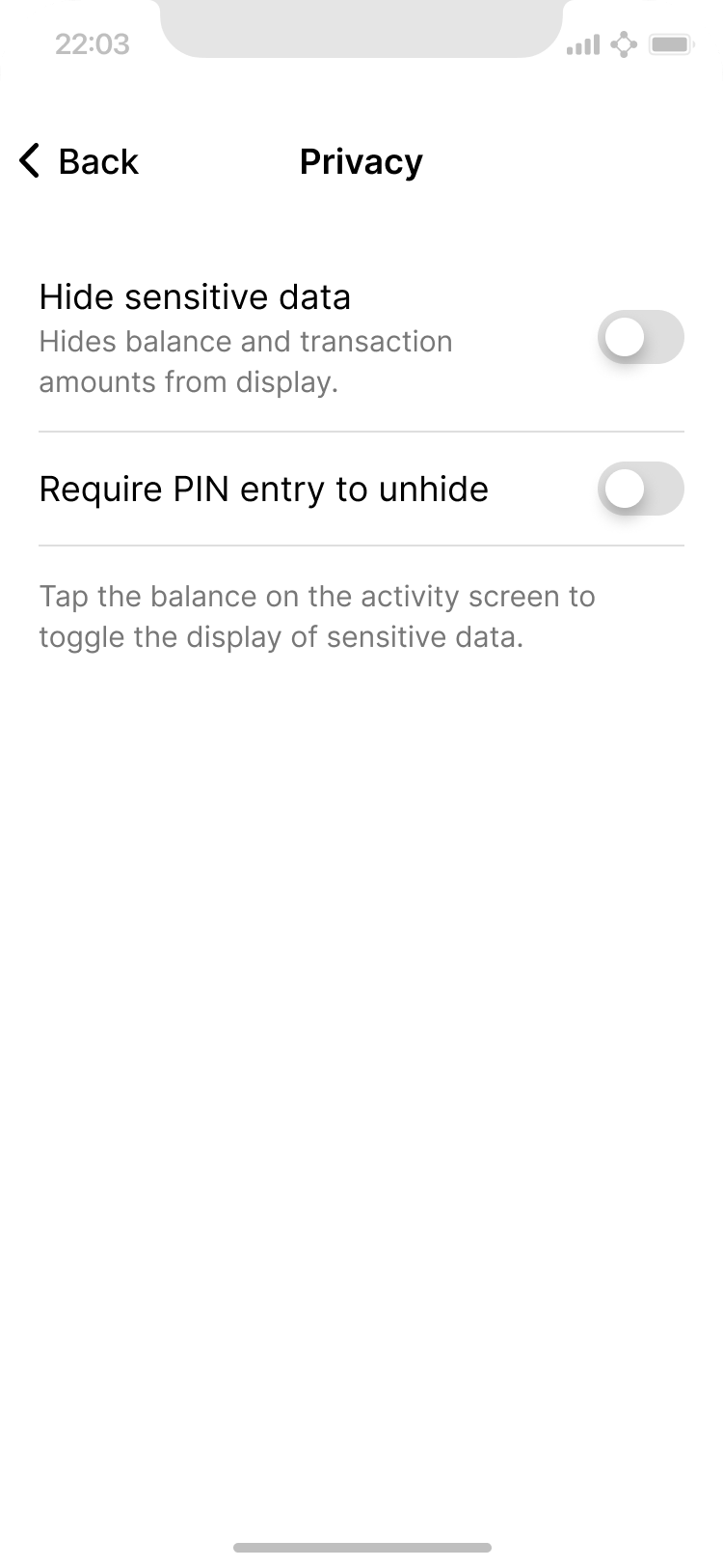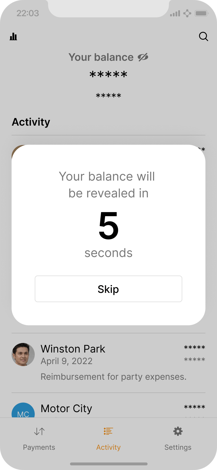Unhiding the balance requires tapping and holding for a few seconds to prevent accidental reveals.