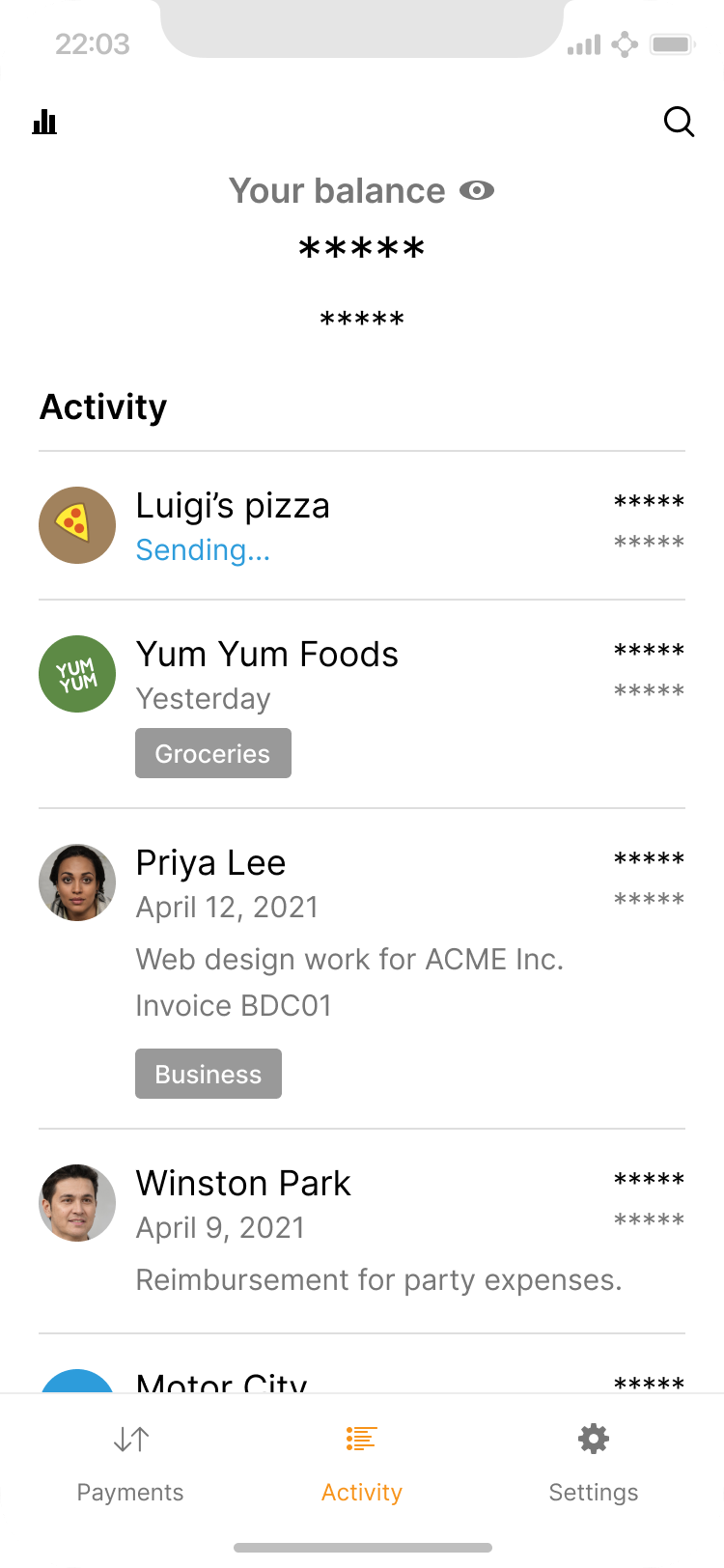 The button to quickly hide sensitive information is displayed within close reach of the balance itself. One tap hides it, and the next tap reveals it again.