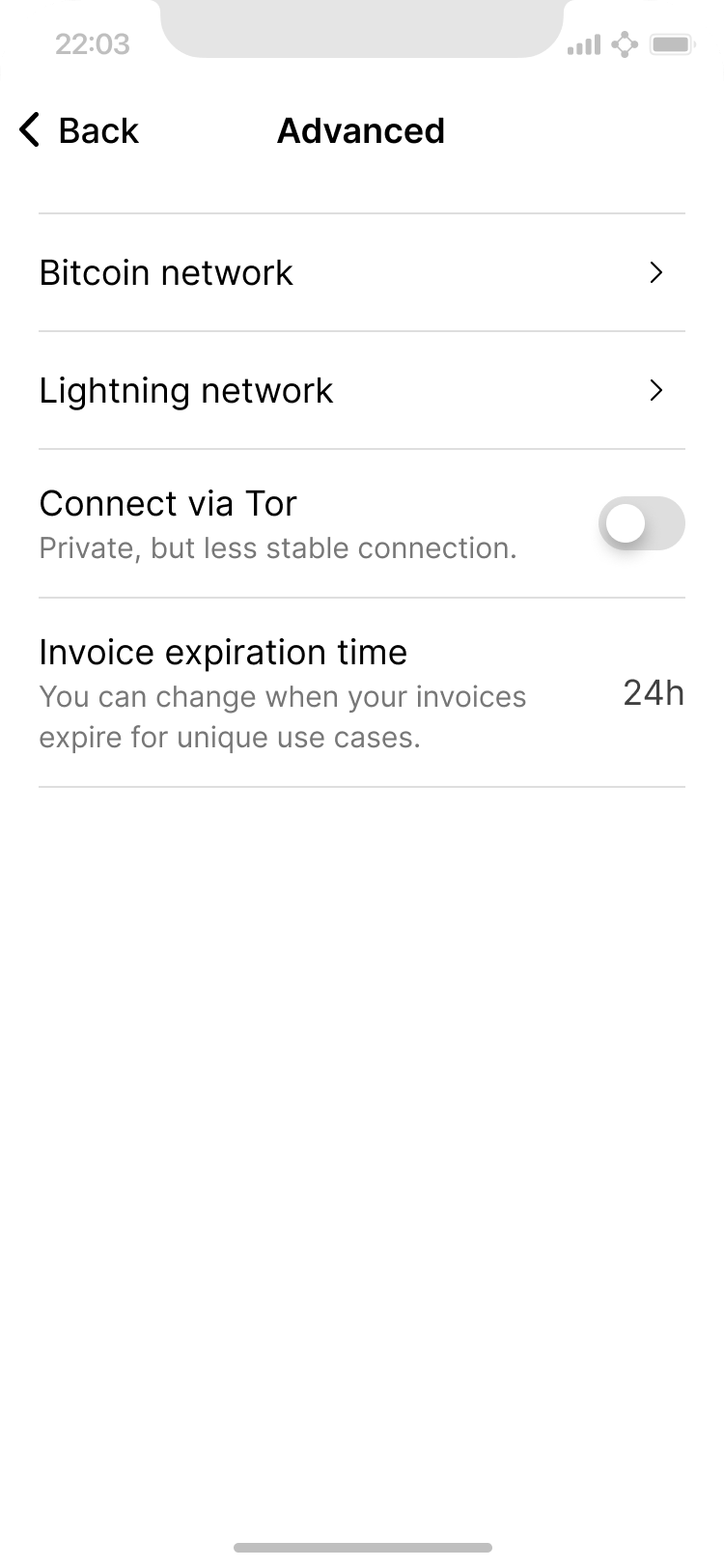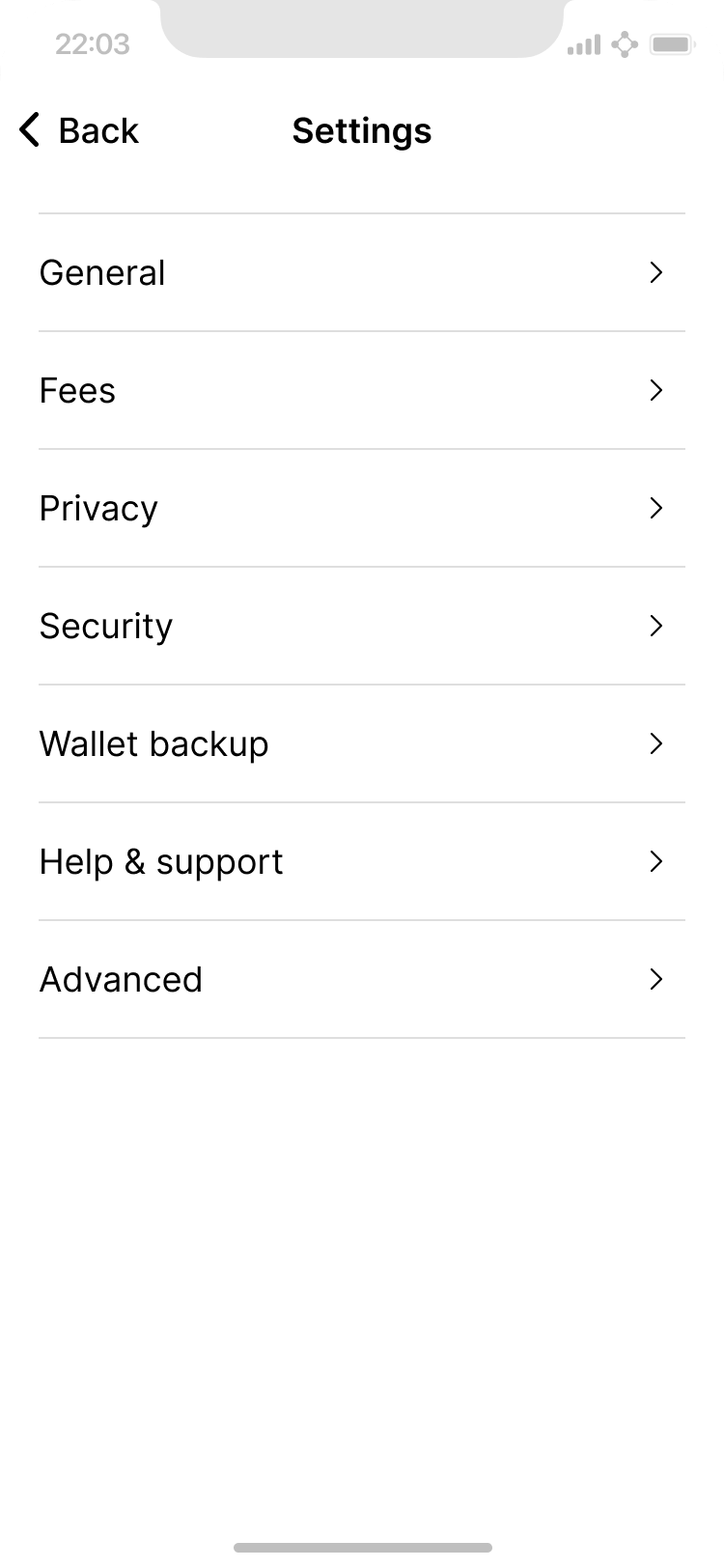 This wallet utilizes ‘swap addresses’ for all on-chain transactions. These are used to facilitate the transfer of received Bitcoin into the user’s Lightning balance. Consequently, the wallet maintains a single Lightning balance, avoiding the need for a separate on-chain balance. This simplifies the user experience and is trust-minimized and non-custodial, courtesy of submarine swaps. We cover these more in our lightning services and receiving pages.