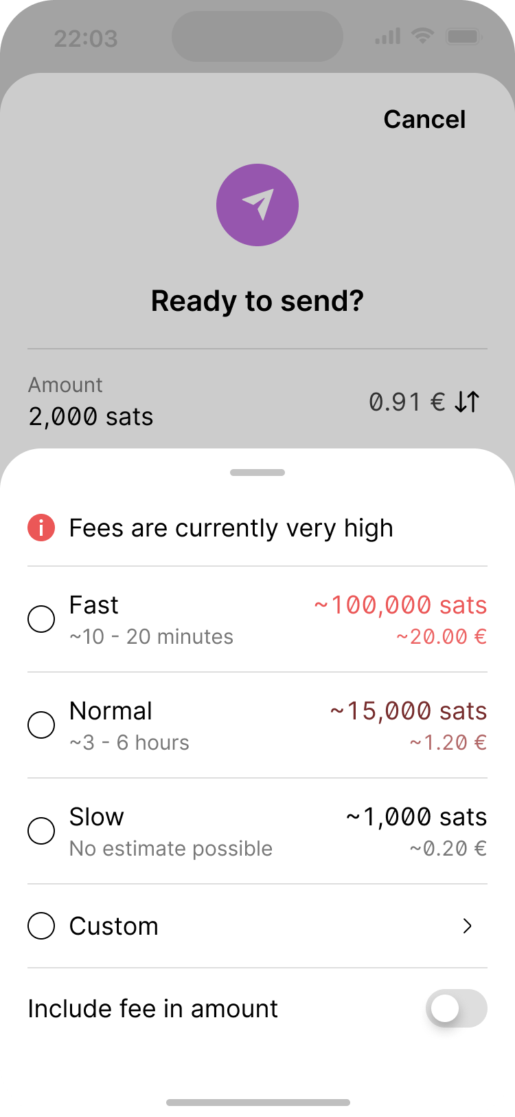 Let’s take a look at how fees surface in a regular send flow, and how users can quickly pull up additional details.