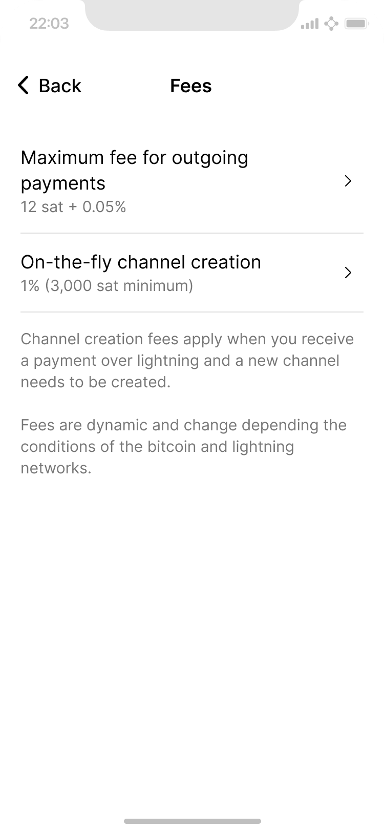 Paying fees for transactions is unavoidable and typically not something users enjoy. Being transparent and communicating them clearly in context (e.g. when reviewing a payment before sending it) is crucial. Since contextual information is selective, this fee screen in settings is needed to provide a concise summary of all the types of fees that may be charged.