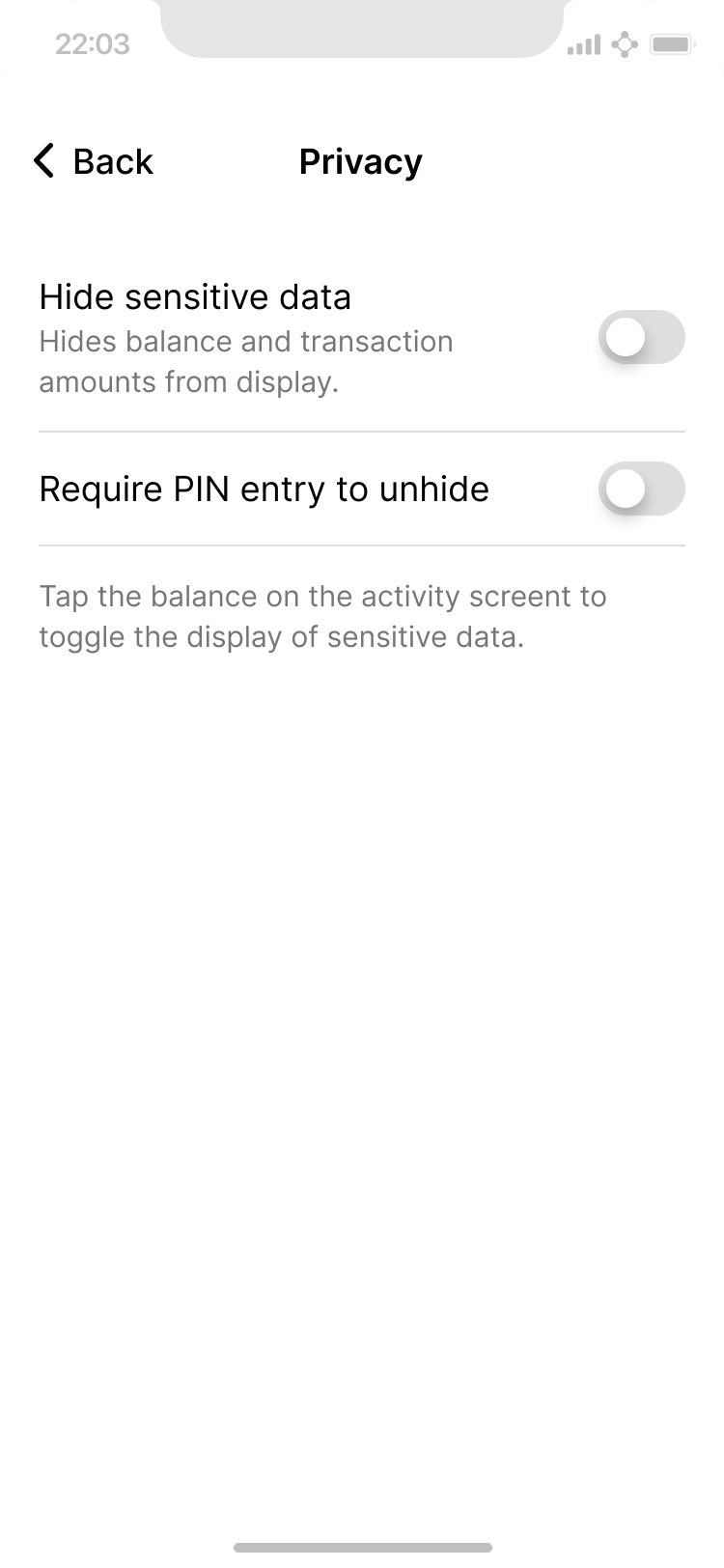 As you probably noticed in previous pages, various settings can be configured contextually throughout the app experience (like hiding and unhiding the balance). All these options, and a few extra ones, are bundled in the settings area.