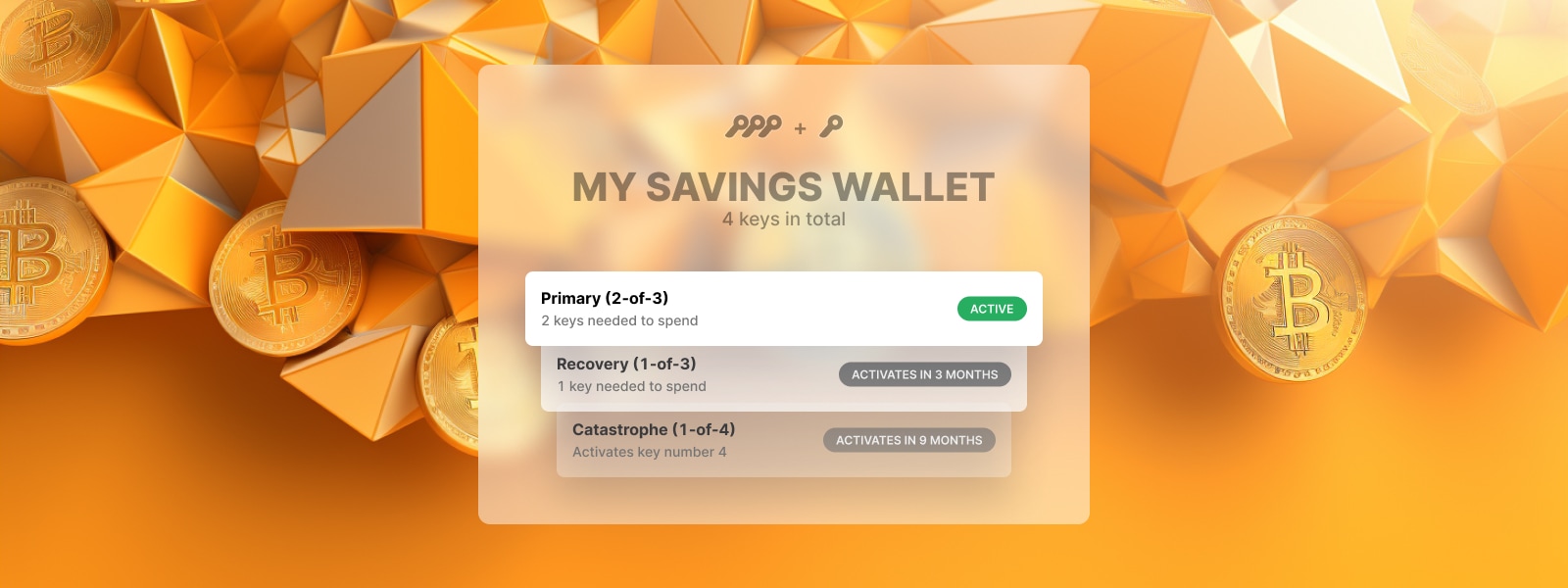 Condition 2 (recovery): After 6 months of wallet inactivity, unlock a second spending condition which only requires one of the three keys to sign transactions.