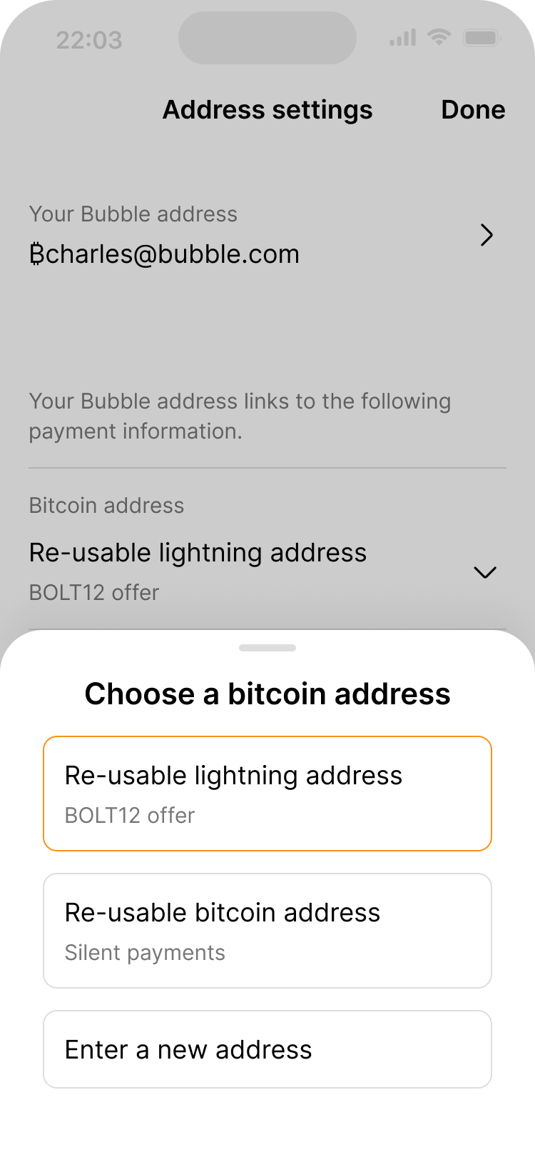 The default bitcoin address linked to the Bubble address can easily be changed.