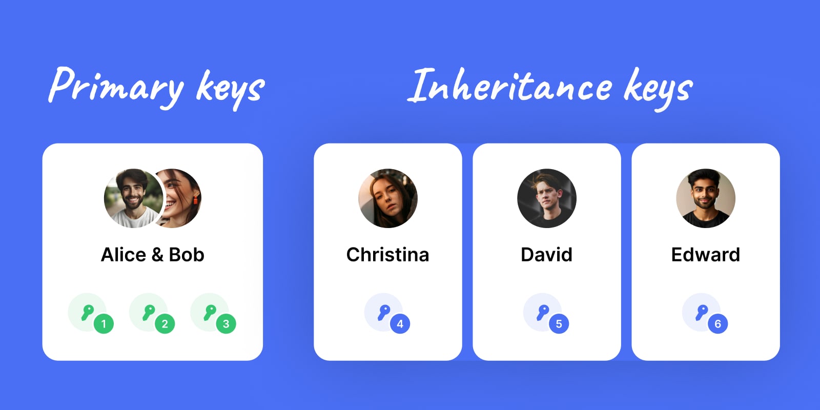 - A dedicated 2-of-3 inheritance key set, which is unlocked 6 months after the recovery key set was unlocked and has not been used. Christina and David will each hold one of the inheritance keys. Edward will hold the third key to assist the children, if necessary.