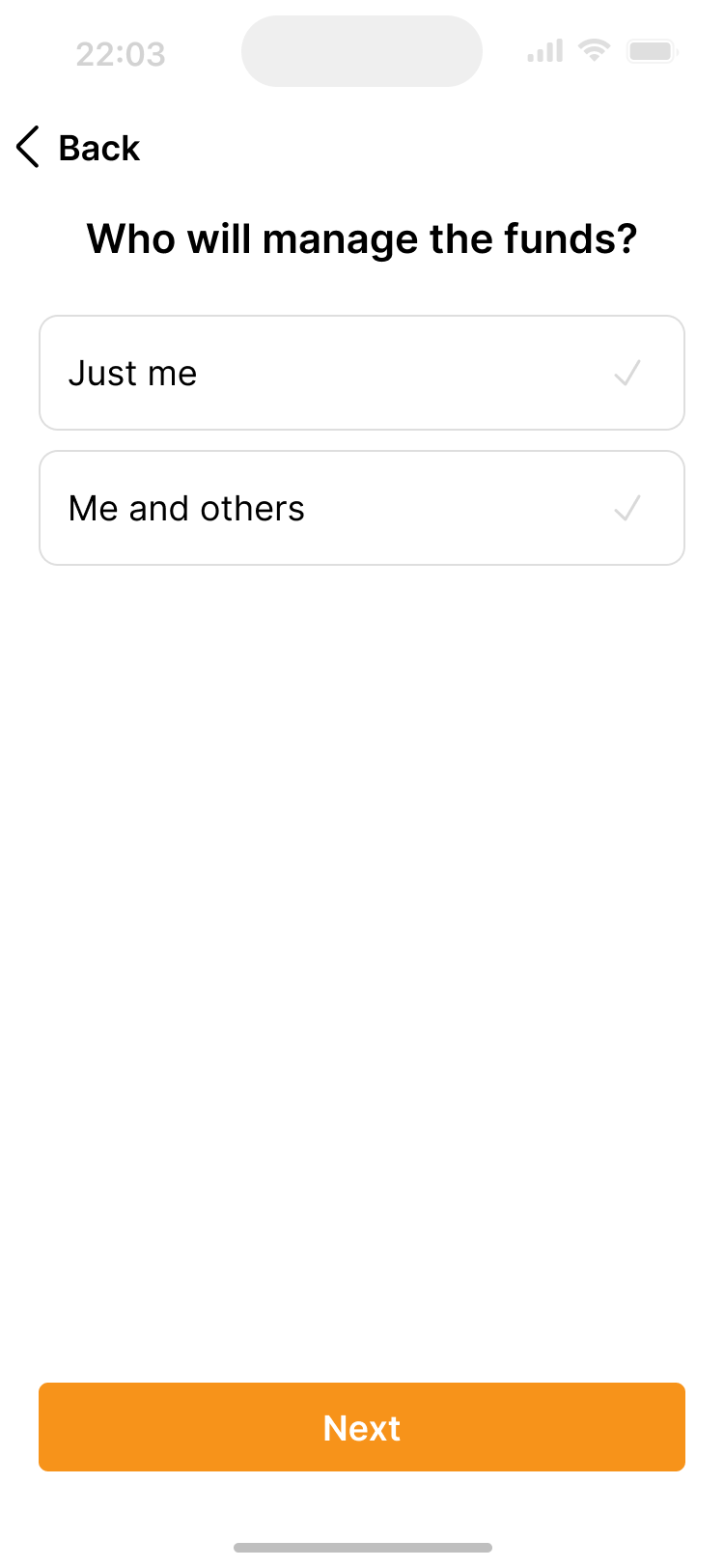 Whichever types of wallets you decide to include in your product, try to guide users towards ones that best fit their use case. Below is an example of structuring a series of questions that result in a recommended wallet configuration. Users still have the option to adjust before committing.